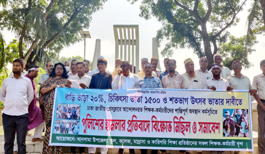 জাতীয়করণ ও ২০ শতাংশ বাড়ি ভাতা বাস্তবায়নের দাবিতে এবং চলমান আন্দোলনে শিক্ষকদের উপর বর্বরোচিত হামলার প্রতিবাদে দিনাজপুরের খানসামা উপজেলায় বিক্ষোভ ও প্রতিবাদ সভা অনুষ্ঠিত হয়েছে। বুধবার (১৫ অক্টোবর) কেন্দ্রীয় কর্মসূচির অংশ হিসেবে খানসামা উপজেলার সকল শিক্ষা প্রতিষ্ঠানের শিক্ষক ও কর্মচারীদের যৌথ আয়োজনে খানসামা পাইলট বালিকা উচ্চ বিদ্যালয় থেকে একটি বিক্ষোভ মিছিল বের হয়। মিছিলটি উপজেলার বিভিন্ন সড়ক প্রদক্ষিণ করে উপজেলা পরিষদ চত্বরে অবস্থিত কেন্দ্রীয় শহিদ মিনার প্রাঙ্গণে এসে প্রতিবাদ সভায় মিলিত হয়। জ...